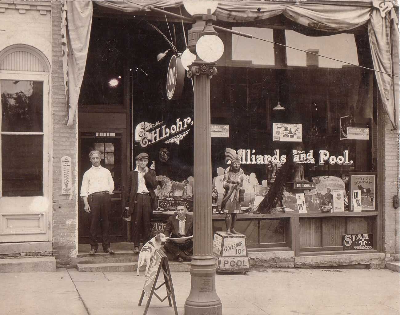 C. H. Lohr Billiards & Pool Hall Columbus - Charles Henry "Charlie" Lohr operated this establishment at 119 E. James St. in downtown Columbus for 35 years, beginning around 1910 until his retirement in 1944. The establishment's name eventually changed to Lohr's Buckhorn Tavern and was next operated by Charlie's son, Paul "Duke" Lohr. Duke was a coronet player with John Phillip Souza's marching band, perfoming Liberty loan drives during WWI throughout the US and Canada. Duke operated the tavern until the 1960's, at which time it was sold. [L-R]: Charles Lohr, and sons Gerald and Harold Lohr.