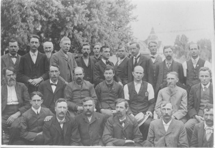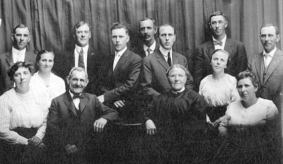 Back row: (l-r) John Dooley (banker, Pardeeville State Bank); John Moran (butcher, Gilmore & Moran); W. Comstock (farmer)*, Winfield Scott (shoes, groceries & merchandise); Ole Lovell; Ralph Parish (harness, Parish & Son); John S. Falconer (department store & dry goods); R.W. Langdon (watch maker & optician, The Pardeeville Hardware Co.); Dr. Jos. Chandler (grist mill), J.V.M. Davies (newspaper); L.P. Ashley (hardware & town clerk); Wm. Achterberg (mercantile store).