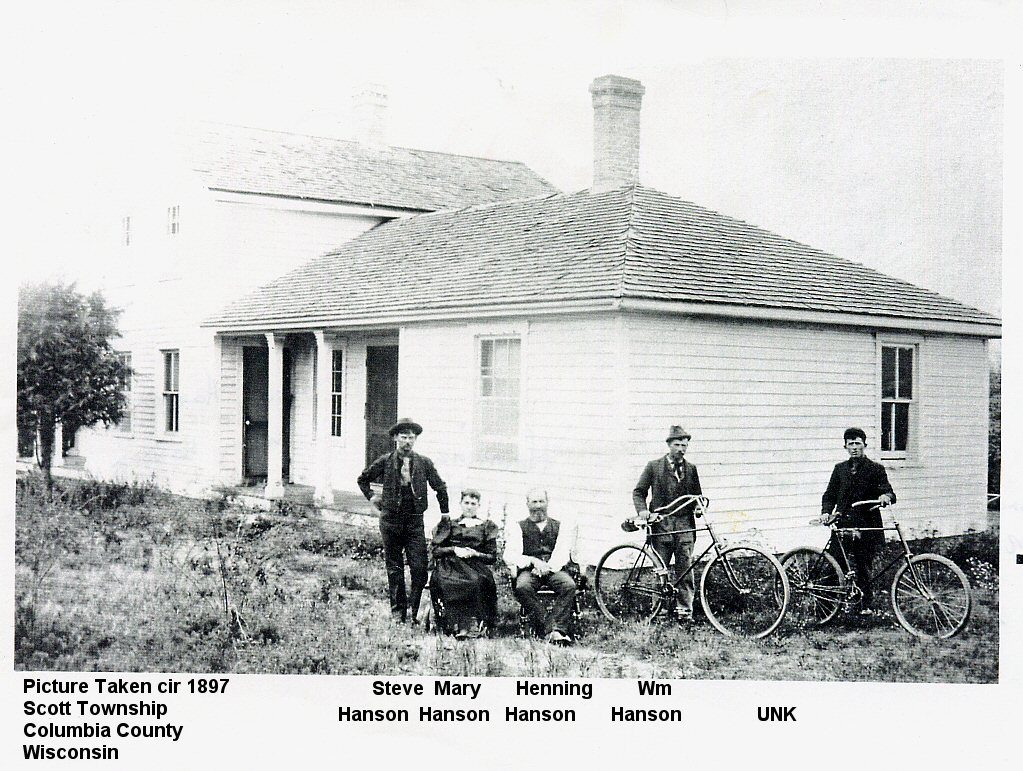 Hanson Family - 1897 Scott Township. Steve Hanson, Mary Hanson, Henning Hanson and Wm. Hanson in front of their home near the Hill Top Creamery.