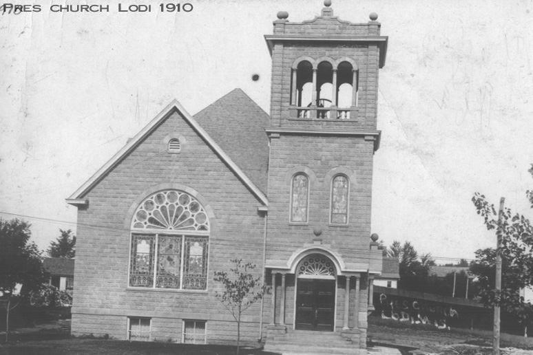 Large group in front of Presbyterian Church in Pardeeville, dated 1909