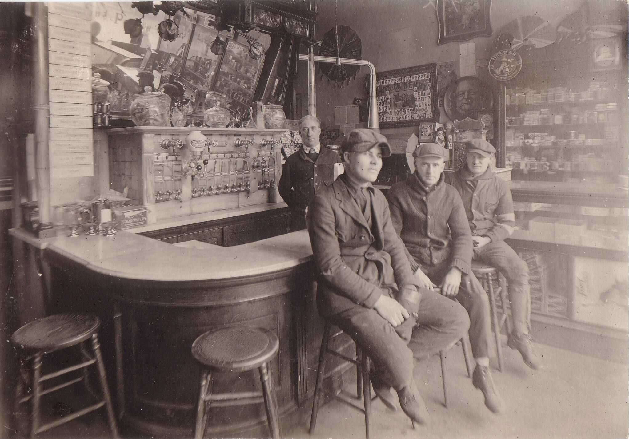 Inside Lohr Pool Hall - Charles Lohr, behind bar. Patrons are unidentified.