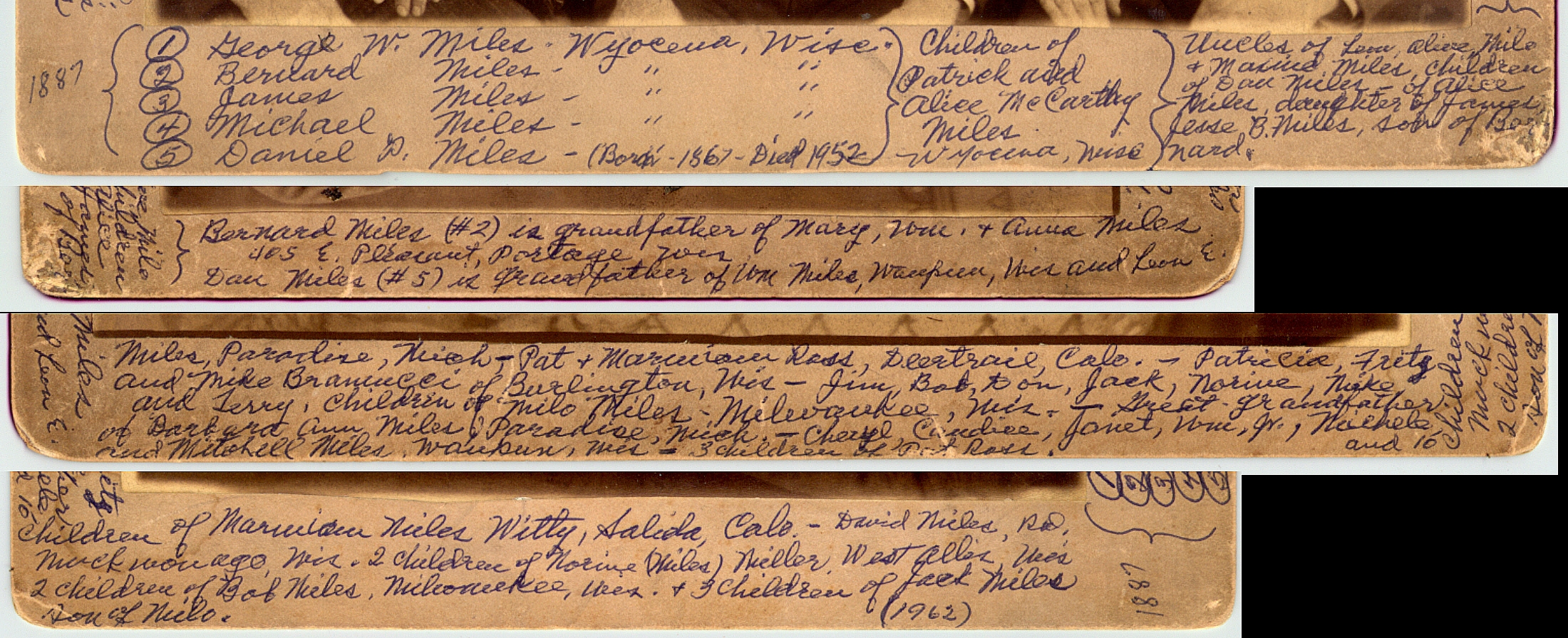Miles brothers of Wyocena - 1887 - Close-up of written genealogy in margin around picture.