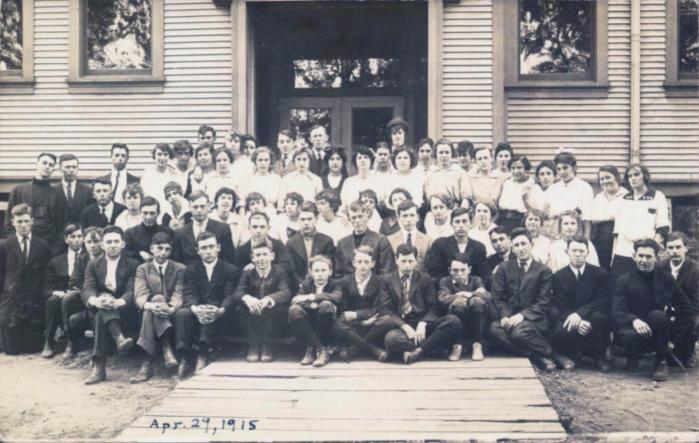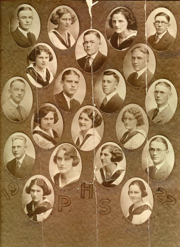 Pardeeville High School Class of 1922 [top] Harland Spicer, Lillian Cook, Theressa Lytle, Byron Hughes; [2nd row] Ruth Zabel, Corliss Tunison, Lawrence West [3rd row] Charles Wendt, Donald Irvine, Willard Smith, Cecil Cuff [4th row] Ruby O'Bleness, Gladys Irvine, Ruth Bertschey [5th row] Walter Beahm, Elfreida Wendt, Mildred Mosher, Raymond Boettcher [6th row] Elizabeth Donovan, Ethel Manthey.