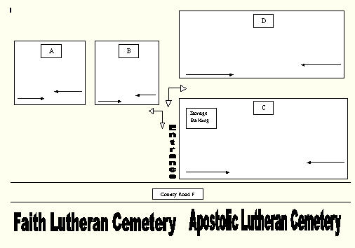 (It looks as though it were all one cemetery.) Apostolic Lutheran Church is just down the road a few blocks and from new information acquired it is used at least once a month for services. There is a new Church further into Maple. Note:You can tell which cemetery each person is buried in by looking at themap of locations. Faith & Apostolic Lutheran Cemetery map