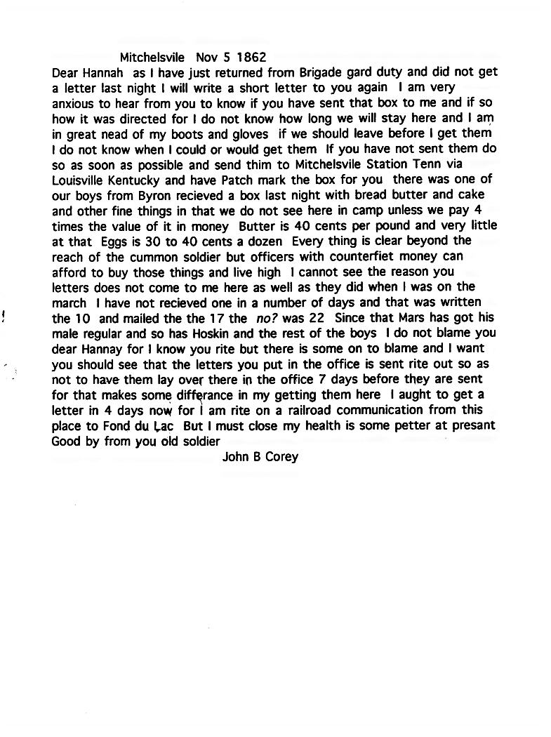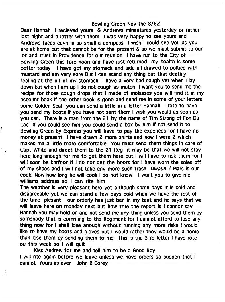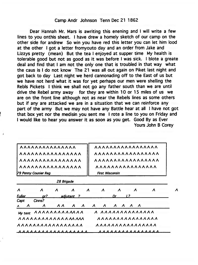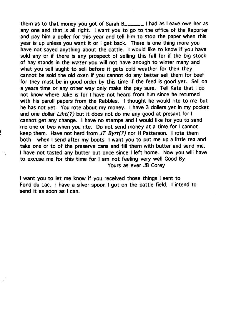 wonderful letters to the Fond du Lac website Joan's mother, May Corey Berglund, a great-grandaughter of John Burhyte Corey, has donated the original letters to the Wisconsin Veteran's Museum in Madison, WI. These letters were written by John Burhyte Corey, of Empire township, Fond du Lac Co. WI.