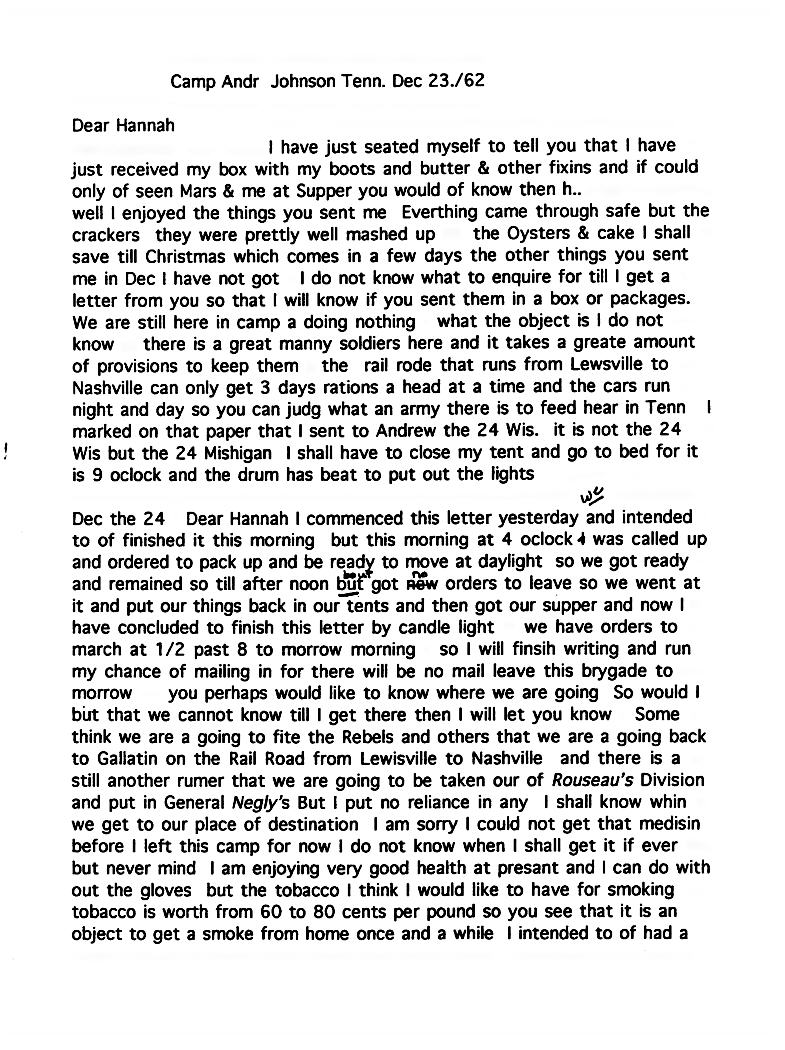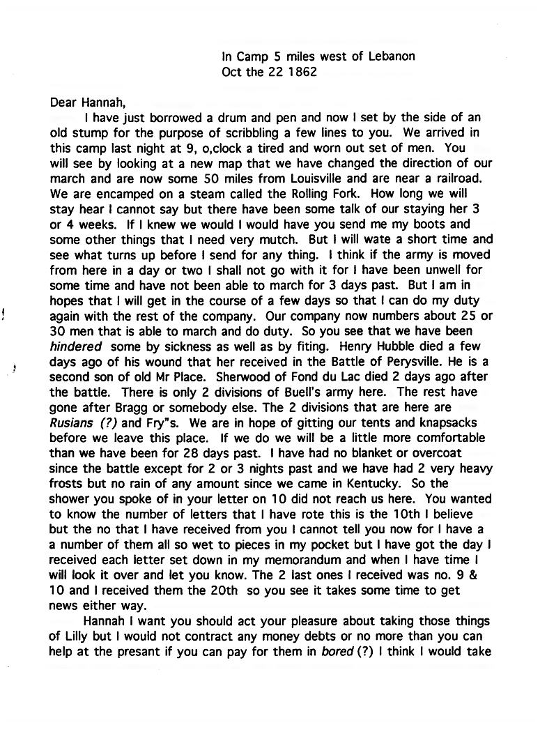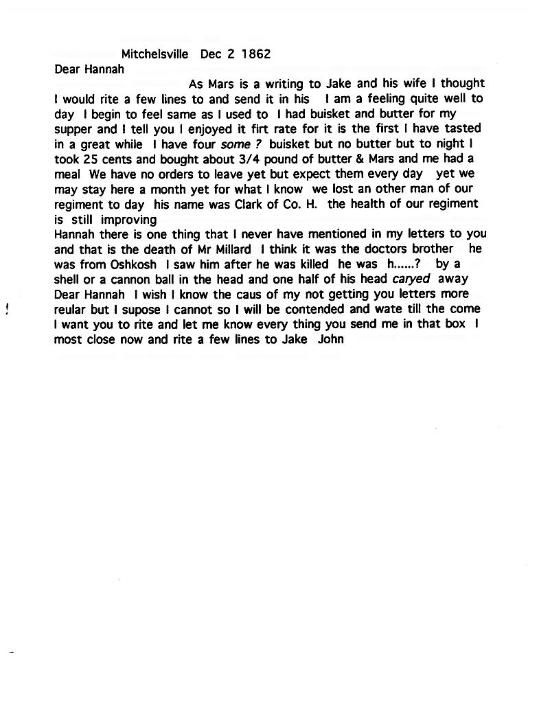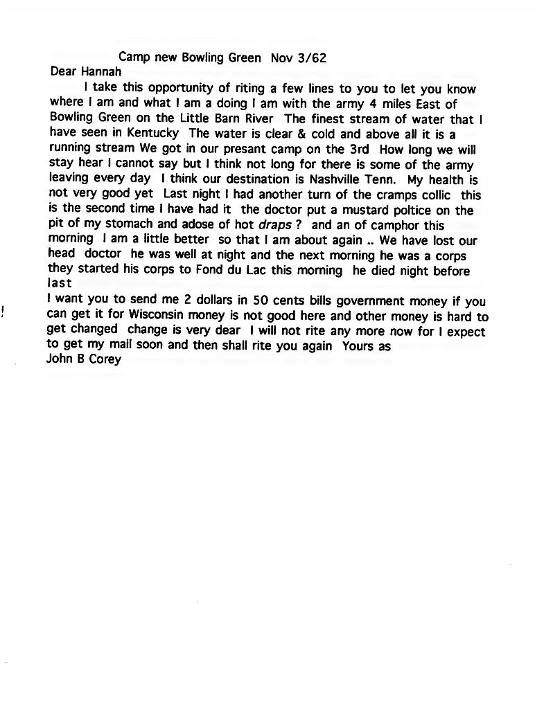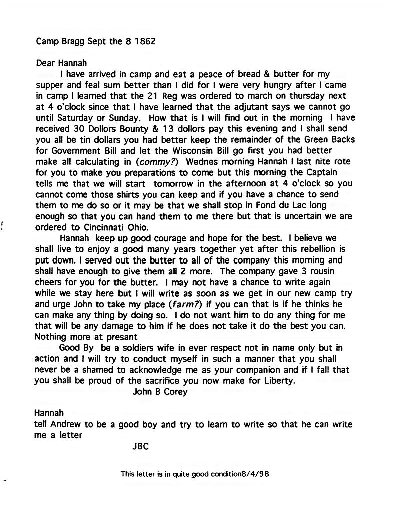 wonderful letters to the Fond du Lac website Joan's mother, May Corey Berglund, a great-grandaughter of John Burhyte Corey, has donated the original letters to the Wisconsin Veteran's Museum in Madison, WI. These letters were written by John Burhyte Corey, of Empire township, Fond du Lac Co. WI.