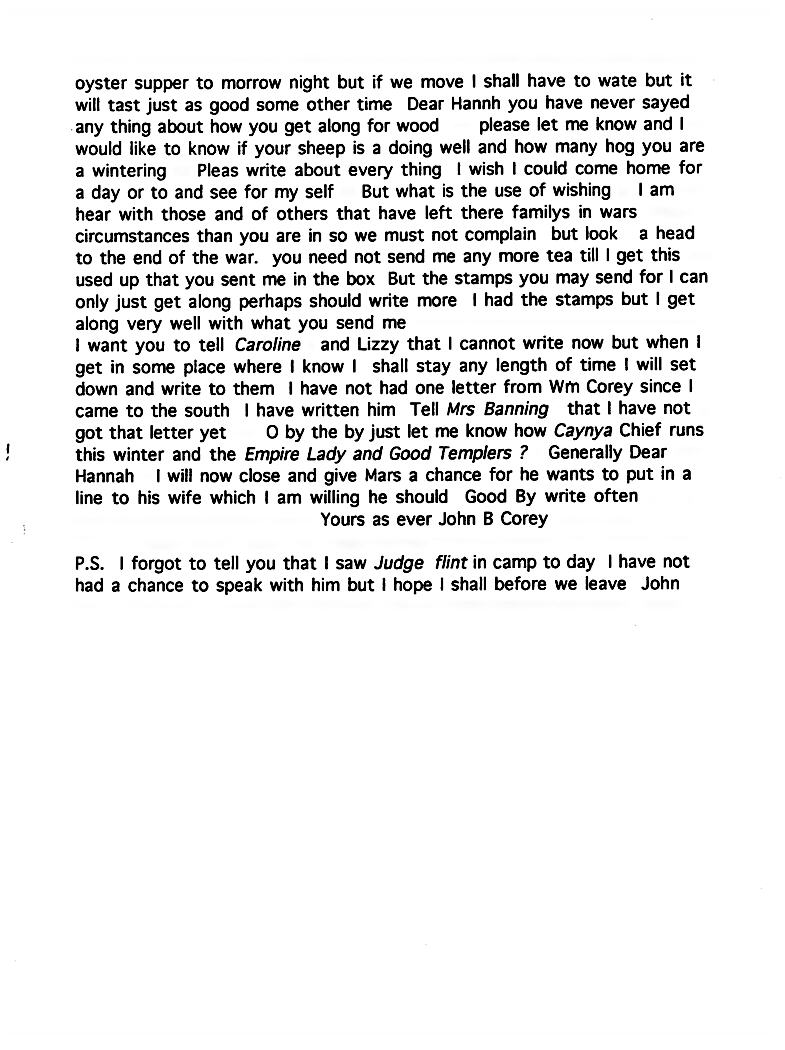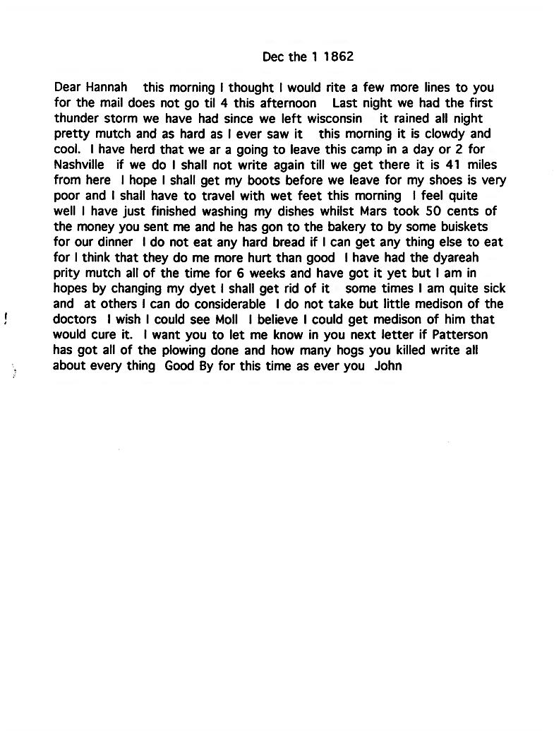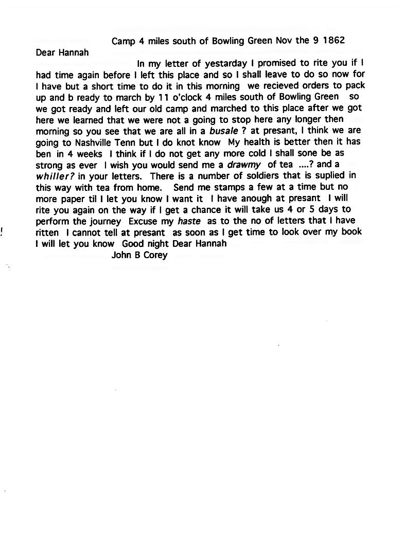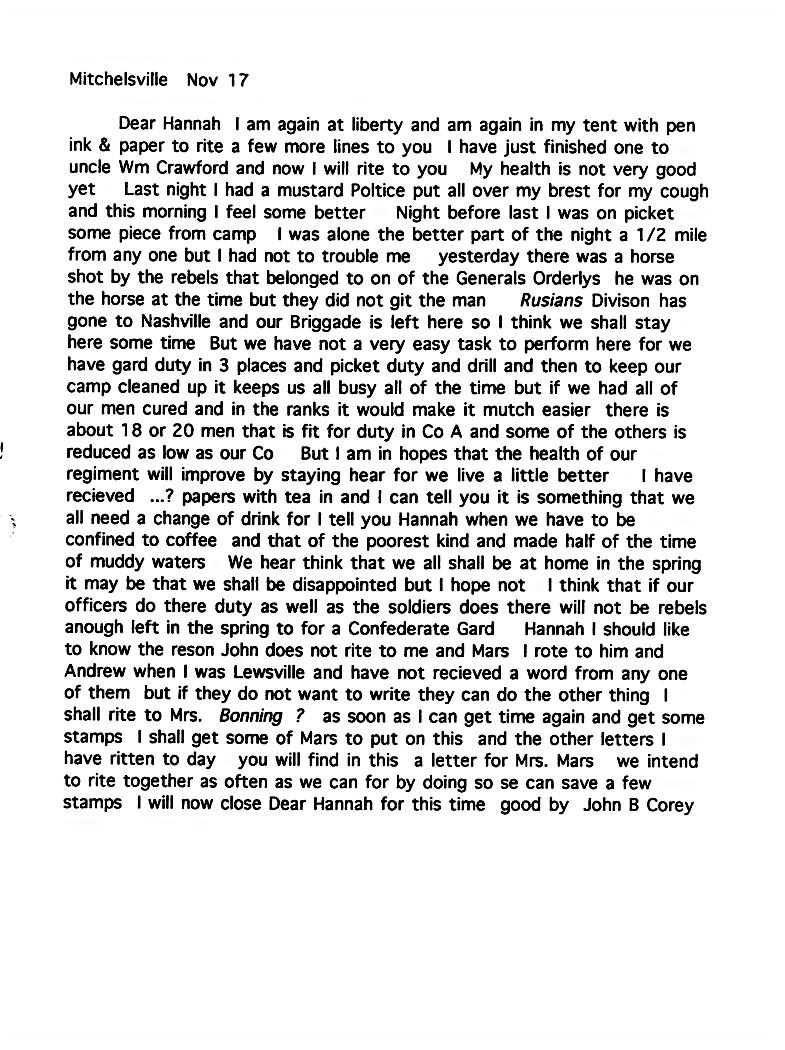 The letters here were written by John to his wife Hannah Burhyte Corey (his first cousin). John and Hannah had one son, Andrew Burhyte Corey, born Oct 23, 1853 in Taycheedah township. Andrew married Clara Florence Hitchcock of Empire township, on March 14, 1872 in Lamartine. |