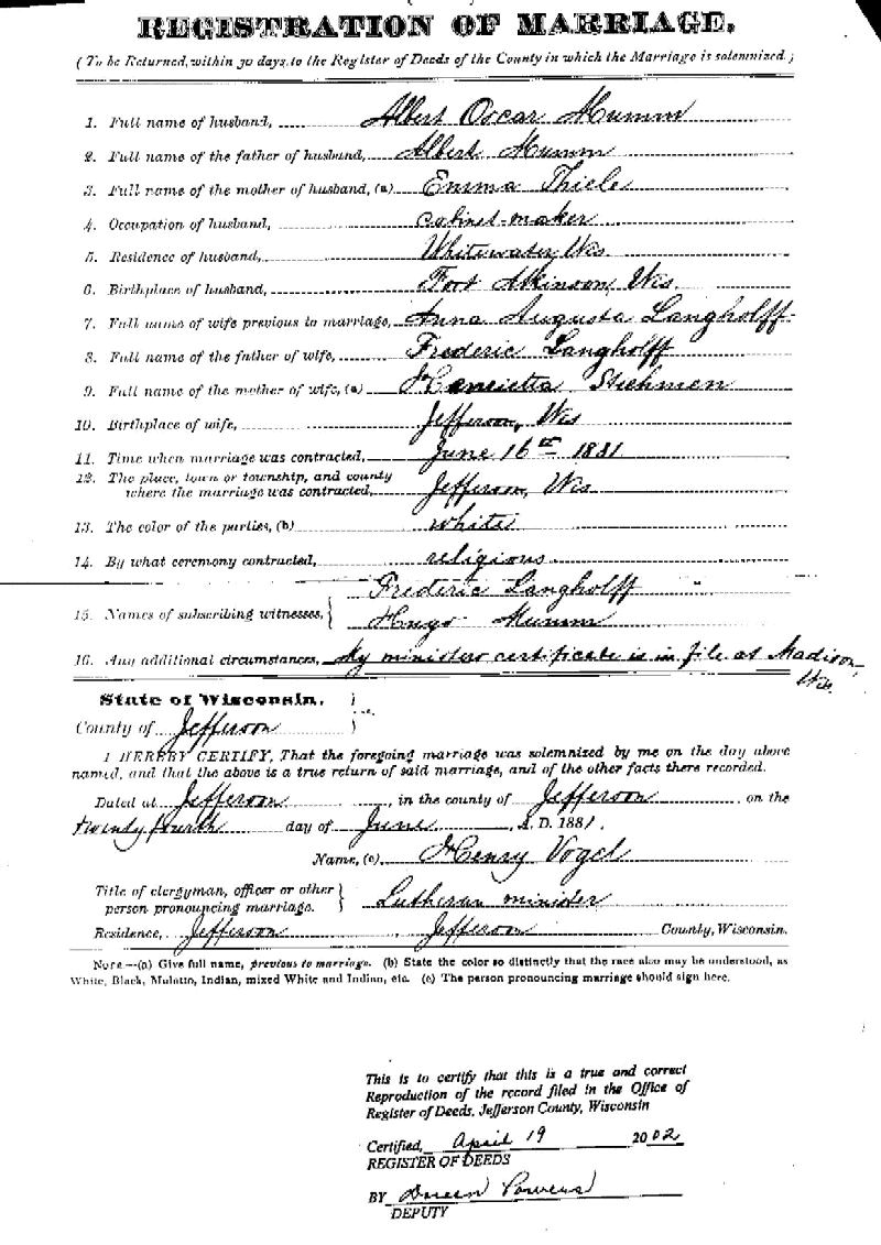 Ahmumm - Langholff Marriage Certificate
