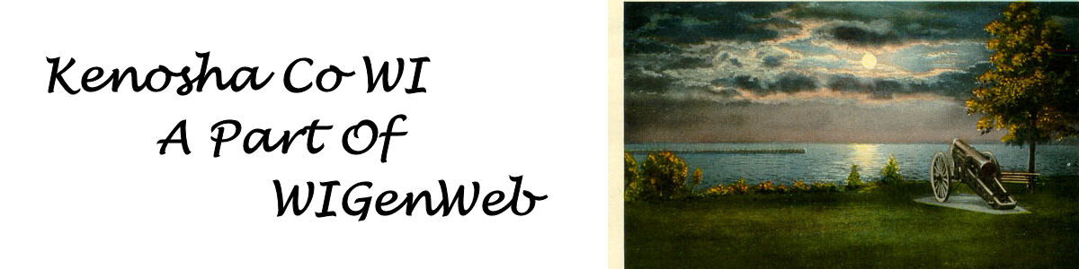 WIGenWeb Acting State Coordinator Marcia Ann Kuehl WIGenWeb Assistant State Coordinator Rebecca Maloney Kenosha County WIGenWeb County Coordinator Rebecca Maloney Copyright 2010 by the WIGenWeb Team. All rights reserved. Copyright of Submitted items belongs to those responsible for their authorship or creation unless otherwise assigned. |