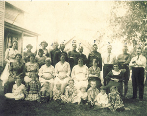 Submitted by Ann Pape. First row: 1. Amy Hansen 2. Mrs. Fitzgerald 3. Chris 4. Soren Nielsen (Sam) 5. Mr. Hansen 6. Oscar 7. Peter Jorge 8. James 9. Charles 10. Henry 11. Julius Second row: Laura, Maggie (Carl behind her), Trina, Mrs. Hansen, Mrs. George, Ollie, Emma Third row bottom: 1. Mary (Charlie's daughter) 2. Marqureitte (Charlie's daughter) 3. Clifford 4. (not sure of identity) NOTE: Bottom row may not be entirely correct. Mary and Marqureitte are Charles and Laura's daughters. Clifford, Elmer, Carl, and Henry are Julius and Maggie's sons. Esther, Evelyn, Laura, and Ollie are Julius and Maggie's girls. Evidently all the children are not in the photo. Picture taken between 1916-1920 on Grandpa's farm, Kenosha, WI NOTE: Last name is Andersen for all above listing only first names. |