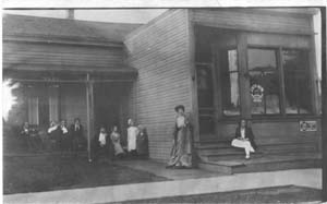 Submitted by Ann Pape. The photo of this house shows 3 woman during same era World War I. The women to the right of the photo are Emma Anderson (sen) her mother, Trine, and daughter-in-law Margaret (Garrett) Anderson(sen). There is a note on the back of card undated which says "This is our house can you find me? I sleep upstairs by the two windows, See our service flag." (Ann believes this note was written by Emma) (Folks by bushes, do not have identification. Ann enlarged the photo and one of the children appears handicapped.) |