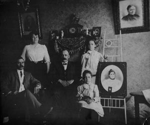 In the large photo, left to right as you view it: Photo on wall- Thomas Zievers; b. 1831, Fliessem, Rheinland-Pfalz; buried St. George's, Kenosha. Photo on wall- Sibilla (wife of Thomas); b. 1836, Germany; buried St. George's, Kenosha. Photos on mantel- I can identify only one for sure, although I have them all. Foreground- Ed Dolan; all unknown (maybe of Sheboygan). Kate Zievers Dolan; b. Kenosha?, buried unknown. Lawrence Zievers (my namesake); b. 1865, Richmond, WI or IL (different papers say one or the other); buried St. George's, Kenosha. Girl seated- Irene Zievers (my grandmother); b. 1896, Milwaukee; buried St. Joseph's, River Grove. Girl standing- Ethel Zievers; b. 1895, Dubuque; buried unknown. Photo on easel- Louise Moeller Zievers; b. 1875, Kenosha; buried St. George's Kenosha. Small photo with photo of Louise Moeller- Unknown, but a guess of an infant child who died. |