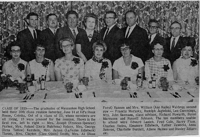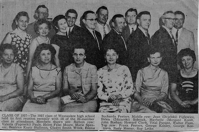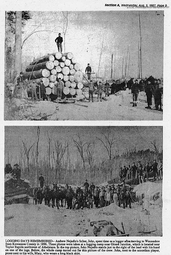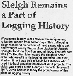 Many of the following images are from a newspaper edition published for the Wausaukee Centennial on August 5, 1987. Thanks to Tracy (Patz) Lentz and Lisa (Edlebeck) Wentland for providing these images. More descriptions will be added as time allows. Links followed by the notation [PDF] require Adobe Acrobat Reader to view/download. You can download the free software from the Adobe Web site. Newspaper clipping about logging sleigh -- The sleigh was crafted by Joseph Spangler for John Bouillon about 1900 and was later leased to Anton Jicha. David Schlies with historic logging sleigh Louis Edlebeck and son George using sleigh to haul gravel Celebrating in style [PDF] -- In this pre-1910 photo Wausaukee's sidewalks were jammed with spectators for the annual July 4 parade. Senator H.P. Bird was the parade marshal. The Bird and Wells smokestack is visible in the distance, and Monroe's log cabin, decked with flags, is at the right. After the parade it was customary to adjourn to Evergreen Park for the day. Farm of Anton Edlebeck [PDF] (Mr. Edlebeck was married to Caroline DeGroot). Wausaukee Band, 1917 [PDF] -- Identified in photo are Louis Polomis, Bud Londo, Pete Polomis, Roy Riley, Andrew Payant, Matt Pelnar, Bert James, Austin Christ, Frank Martin, Vernon Hallenbeck, Seth Ferdon, Loren Nowell. Wausaukee State Bank (est. 1901) and Wausaukee Feed Mill and Elevator [PDF] -- The mill was operated by Amos Christ and George Smith. Before Prohibition [PDF] -- A photographer caught some of the boys tipping a few. Identified in photo are Henry DeGroot, Adam Pleckinger, Anton Edlebeck, Barney DeGroot and Carl DeGroot. Rustic Saloon [PDF] -- Photo of George Underwood's log cabin saloon, complete with a deer carcass hanging at the door. Includes clip from the Wausaukee Independent of 1901 about the amount of beer consumed in the village. Wausaukee High School Class of 1937 Wausaukee High School Class of 1939 WWI Doughboys -- Identified in photo are Frank Shields, Anton Forst, and John Edlebeck.
