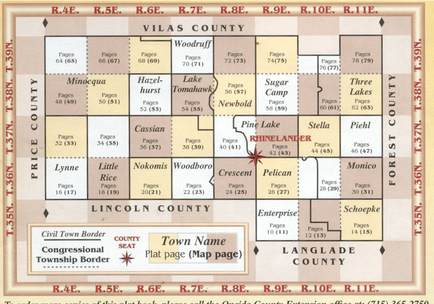 ONEIDA COUNTYThe difference between "township" and "town" often confuses the public. In Wisconsin, "township' refers to the surveyor's township which was laid out to identify land parcels within a county. Theoretically. a township is a square tract of land, measuring six miles on a side for a total of 36 square miles in the unit. Each township is divided into 36 sections. "Town", as the word is used in Wisconsin, denotes a specific unit of government. It's boundaries may coincide with the surveyor's township or it may look quite different. A Town may include one, parts of or several townships For example: the 'Town of Minocqua' includes almost 5 complete townships but the 'Town of Hazelhurst' only one township. To learn more about land discriptions visit Public Land Survey System (PLSS) Tutorial or Map Clicking on these links will open a new window, close to return here. ![]() {click on map for larger version} Source: Oneida County Land Atlas & Plat Book, 2000 millennium editon; sponsored by Oneida County 4-H; publ by Cloud Cartographics, Inc. |