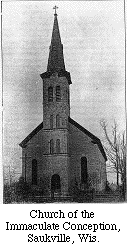 Nine years from the advent of these people into Ozaukee County, a meeting was held by the Catholics for the purpose of forming a congregation. At its assemblage, which occurred February 24, 1856, Father SEIF being present, a resolution was prepared requesting the consent of the Bishop, the Rt. Rev. John martin HENNI, for the erection of a church at that place. In spite of their many efforts, however, it was a number of years before the Catholics at Saukville were enabled to worship God in their own church. The first effective move in this direction was in 1865, when the Rev. Father RASCH was sent at pastor. He was succeeded by the Rev. Father STRICKNER in 1866, who remained about one year, when he was succeeded by the Rev. Joseph VOISSEM. This pastor built the first Catholic school at Saukville, and remained, administering to the spiritual wants of the people and improving the property of the parish,whenever such opportunity occurred, until May, 1872 when Father ALBERS succeeded to the pastorate. He found the old church too small for the proper accommodation of the people, and so at once made arrangements for the erection of a larger and more desirable structure. This building, which is still in evidence, was dedicated in 1875.