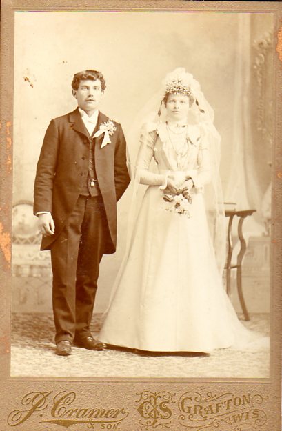 This photograph was found on the back of an antique frame purchasedat a store in Atlanta, GA. The store owner said it came from an estate in Indiana.Janine Rousseau, who purchased the frame, generously contributed the photograph.She assumed that since the photographer was in Grafton, the couple may have been from the area and thought it should be returned to the area. If you recognize the wedding couple, please contact me.