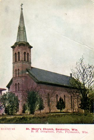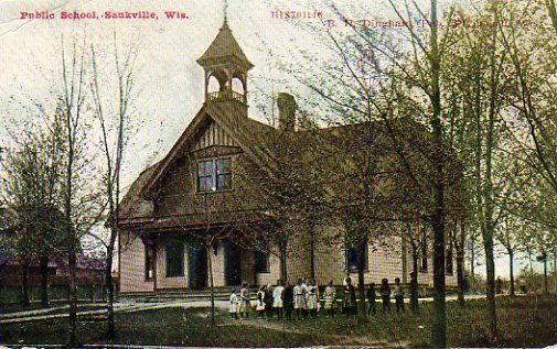 *According to Cindy Douglas at the Saukville HistoricalSociety, This building is no longer. It once stood where the current Oscar GradyLibrary stands, but further back from South Main Street . When the current buildingthat we see now as the library was built in 1924, the school building in the colorpost card was MOVED to the corner of Highway 33 and South Main Streets! It was calledat one time the Firemen’s Hall. My mom and dad held their wedding reception therein June 1946 when they married. It was used by many people for parties and such.I remember as a little girl (1st – 2nd grade age) the nuns used to walk us kids downthere to watch school plays put on by the older students from St. Mary’s School (nowknown as Immaculate Conception Church). So, there are many memories there! It wastorn down in 1961 and a new fire station was built there in 1962. It is now knownas “Patrice’s” (restaurant).