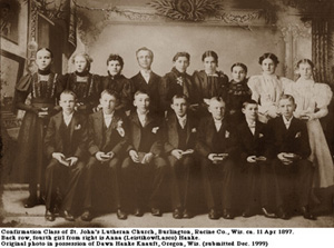 GenWeb Project in 1999. St. John's Lutheran Church, Burlington, Racine Co., Wisconsin confirmation class circa 1897. Perhaps someone can help identify the others in the photo. Dawn M. Knauft |