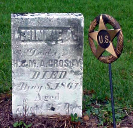 ----- | May 8, 1861 | Dau. of H. & M. A. CROSBY; Aged 7 M. 25 D.; U.S. flagholder [probably meant for father, Haskell] |