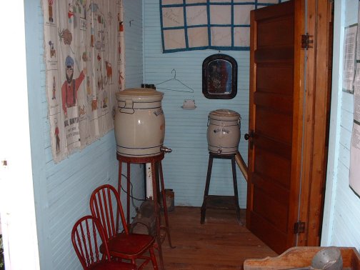 The school was in operation until 1919 when the new central school was opened. "Little Red" was used for a home, garage, and storage building. This photo shows the exterior of the schoolhouse.Now let's go inside the schoolhouse. As you walk in the front door you see a wash stand and two chairs.