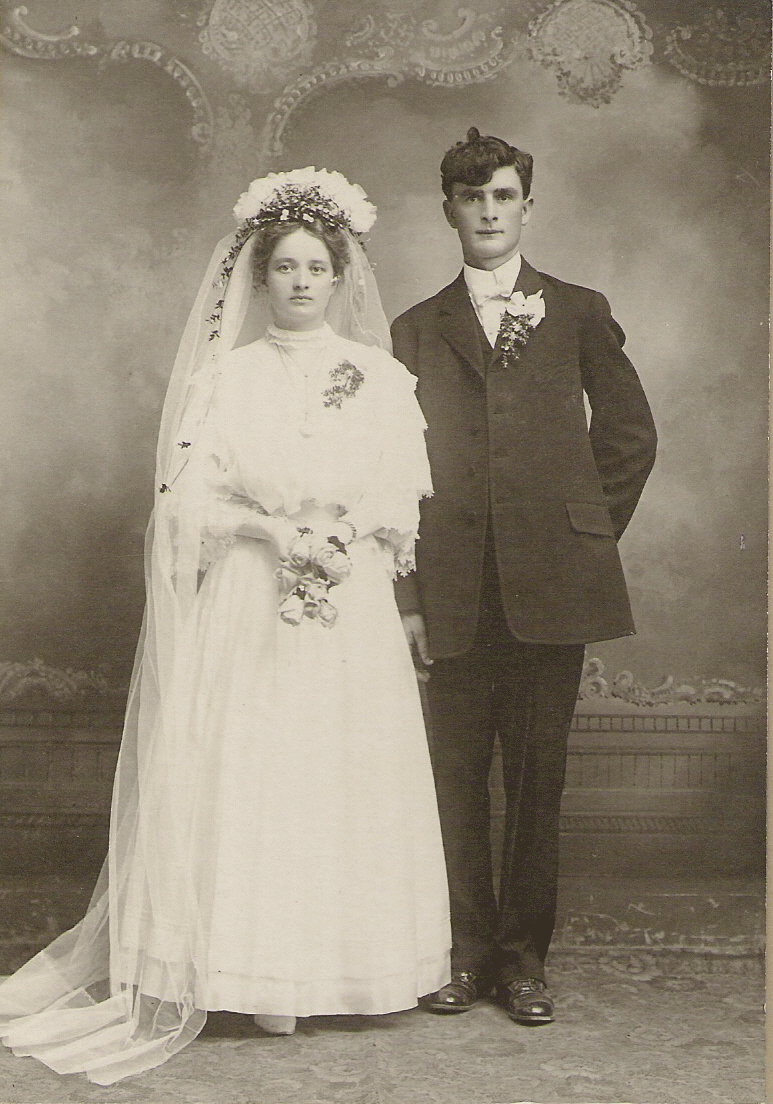 About 1978, my parents gave me a wedding portrait of my grandparents that was still in the original wrapper. With the photo is such good condition, the scan shows great detail. Bertha Schumacher and Willie F. Otto were married 26 Aug 1908 at Elias Church.  The groom used the name Willie to reduce confusion with his father who was called Wilhelm, William, or W.F. Otto. The scan of the invitation picked up most of the embossing. Only the script lettering was printed.  Lois >>>