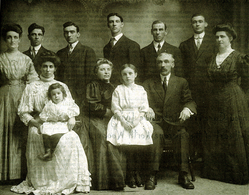 On the back of the photo, written in pencil is "Taken in Shawano, Wisconsin, Dec. 25th 1908" followed by "Family Reunion- first and last reunion".