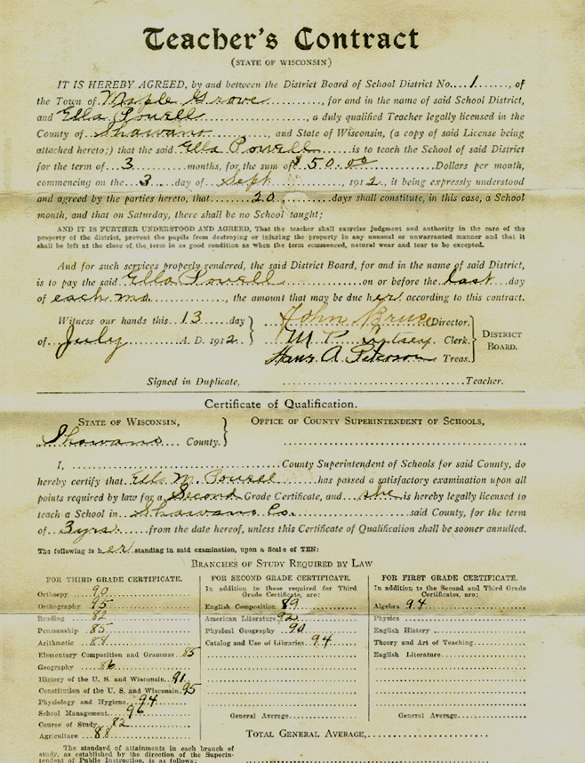 TEACHER'S CONTRACT Miss Ella POWELL - 1912 Maple Grove Twp. sent in by Granddaughter Mary Russell (if you have any information on this school, etc. please send it to Mary at: MSRNTER@aol.com)