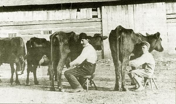 Anton and his son, Arthur J. Brunner milking cows on their family