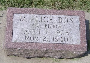 | Bos | M. | Alice | April 11, 1908 | Nov. 21, 1940 | nee Pierce | Cindy Bohn | |