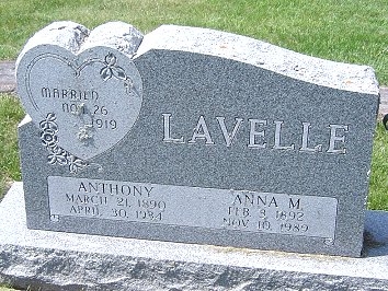 | Lavelle | Anthony | H. | 1890 - March 21 | 1934 - April 30 | Husband of Anna M., Married Nov. 26, 1919, Military Stone | Cindy Bohn | |