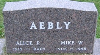 | Aebly | Alice P. | 1915 | 2005 | Wife of Mike W. |
