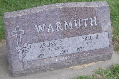 | Warmuth | Arliss R. | 1932 | 2002 | Wife of Fred H.; Nee Berends; Married Oct. 4, 1952 |