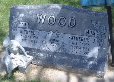 | Wood | Katherine J. | Nov. 8, 1934 | Nov. 7, 1997 | Wife of Richard A.; Nee Gross; Married June 29, 1957; Parents of Constance, Loal, Jennifer and Elizabeth |