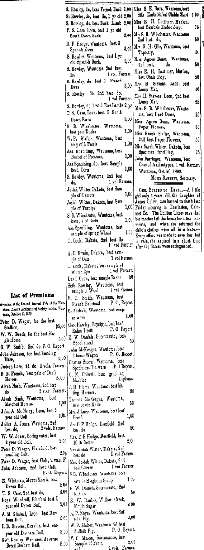 Premiums Awarded - Second Annual Fair of the Waushara County Agriculture Society (Click to enlarge)