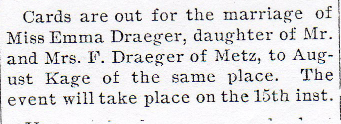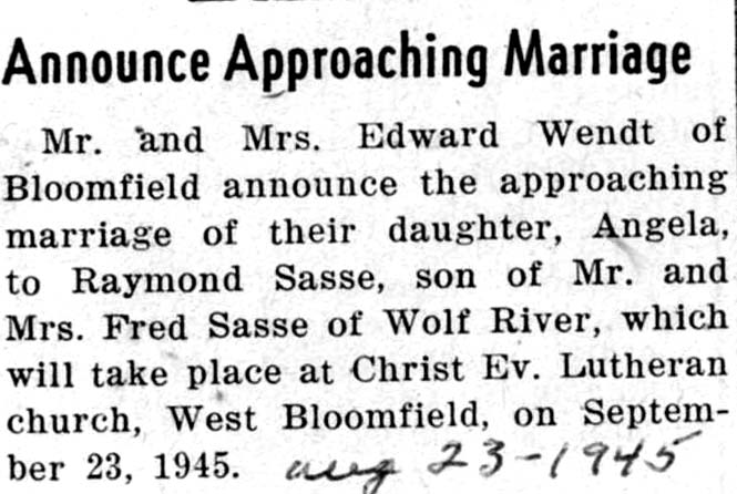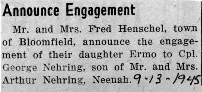 Weyauwega Chronicle Weyauwega, Wisconsin September 13, 1945 Erma Henschel & George Nehring |  Weyauwega Chronicle Weyauwega, Wisconsin August 23, 1945 Angela Wendt & Wm. Sasse |  Weyauwega Chronicle Weyauwega, Wisconsin April 1902 Emma Draeger & August Kage | |