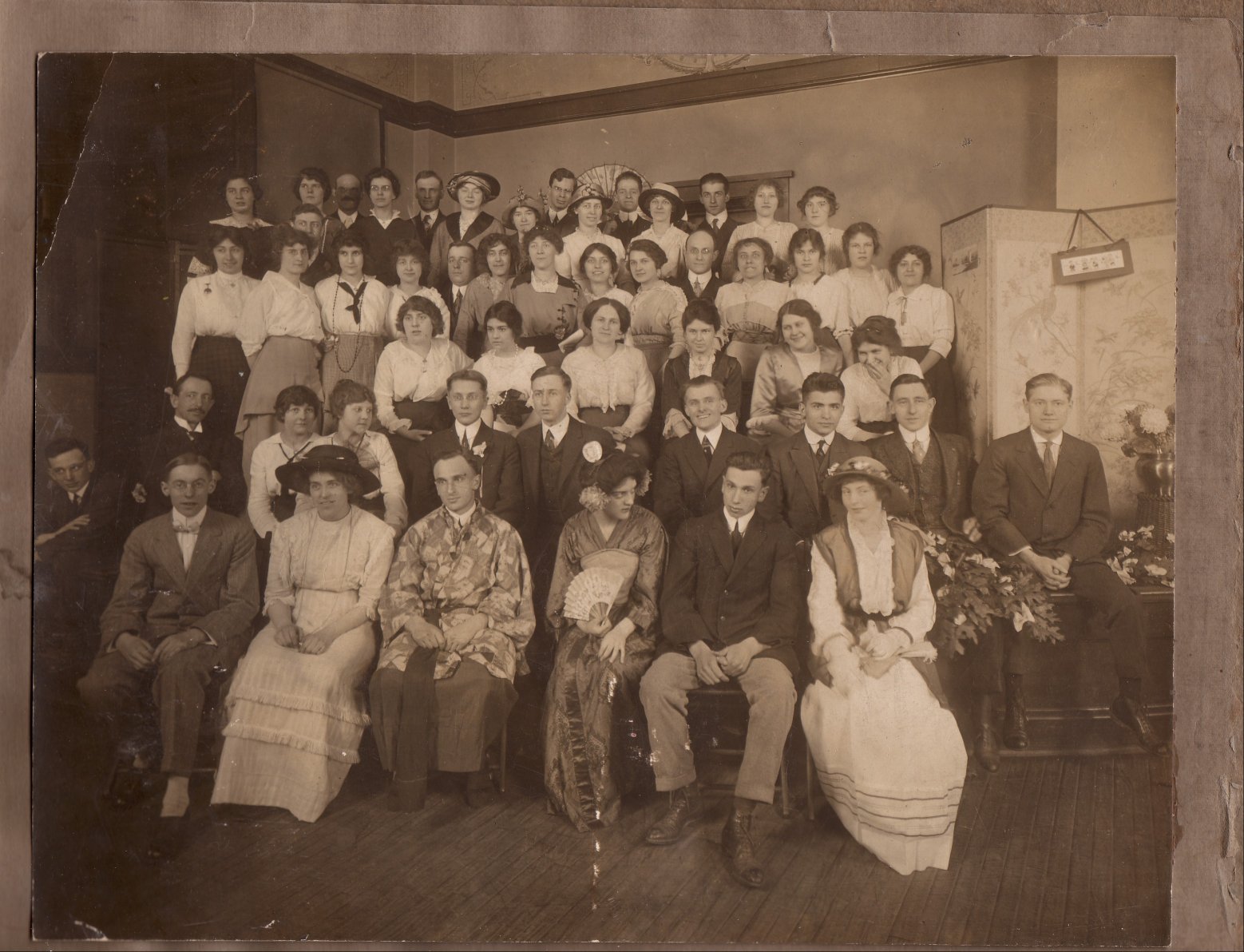 | Photo from the early 1900's that might be of interest to others. Unfortunately, I'm not sure which county it was taken in. The young man seated by himself on the far right is my grandfather, Edwin Henry Juergens (1889 - 1981). He is the only person I can identify. It is believed it was probably taken before his marriage in 1916. The most likely locations would be Columbia County (the 1910 census shows him living in Portage, Columbia County) or Milwaukee County (where he married and lived after 1916). I'm really not sure what the photo is about but, from the costumes of the two people in the front row as well as the oriental screen, I think it might be of an amateur theatrical group. Perhaps someone can supply more information! Kristine Reilly