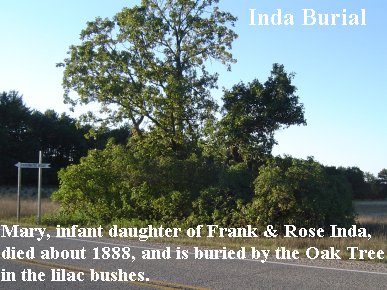 Information from Mrs. F. Inda – Burial, Mary, daughter of Frank & Rose Inda died about 1885 buried by an oak tree in a large bunch of lilac bushes. Information from Inez Pilz to Wayne & Alta Guyant dated May 7, 1979. My aunt, Ann Inda Puddy Moldenbauer, has the original family records and she checked for Mary’s dates of birth and death. She was born February 6, 1886 and died June 6, 1886—age exactly 4 months, the fourth child of Frank and Rose Gregor Inda.