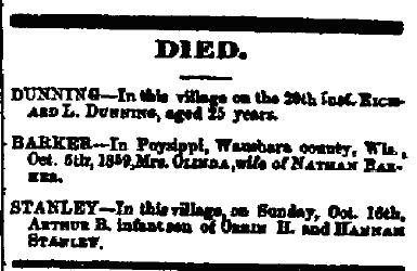 ![]() The Wautoma Journal Wautoma, Wisconsin October 25, 1859 Richard Dunning, Mrs Nathan Barker & Arthur Stanley |
