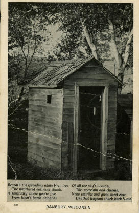 of the Danbury history. It is unknown who's outhouse this is, but chances are very likely that many of our ancestors used similar facilities. The poem at the bottom of this card reads: Beneath the spreading white